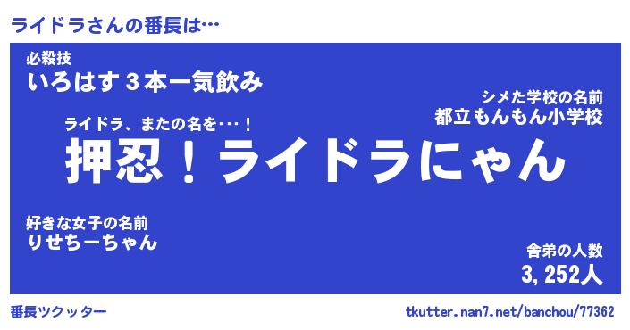 | 意味不明あだ名 | 『ペロリンライドラ』『永久保存ライドラ』 |