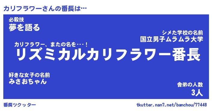 | ヒーロー風カッコイイあだ名 | 『スーパーカリフラワー』『魔戒騎士カリ』 |