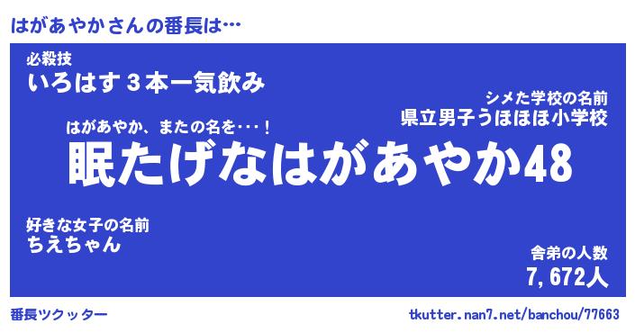 | 伝説のあだ名 | 『封印されしスナイパーはがあやか』 |