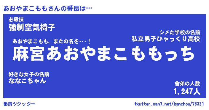 | 伝説のあだ名 | 『不死鳥のスナイパーあおやまこもも』 |