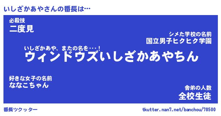 | 肩書あだ名 | 『いしざかあや店長』『いしざかあや団長』 |