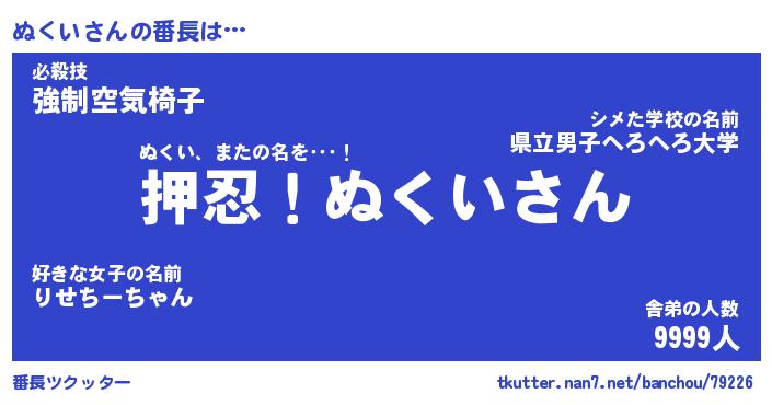 | ポケモン風あだ名 | 『ヌクチュウ』『ヌクイダネ』 |
