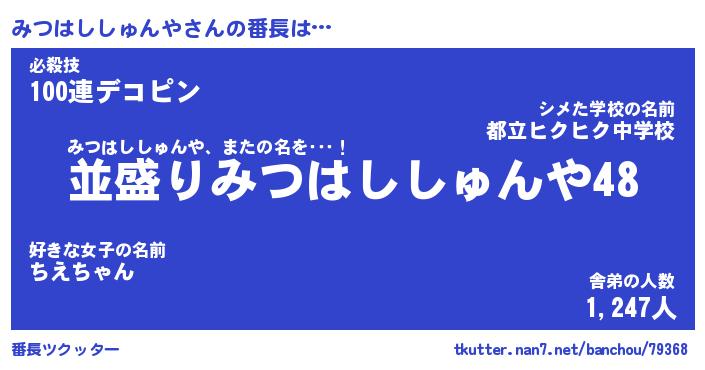 | 伝説のあだ名 | 『不死鳥のスナイパーみつはししゅんや』 |
