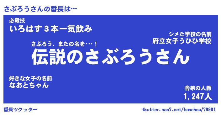 | ファンタジー風あだ名 | 『サブフェル』『エターナルサブロウー』 |