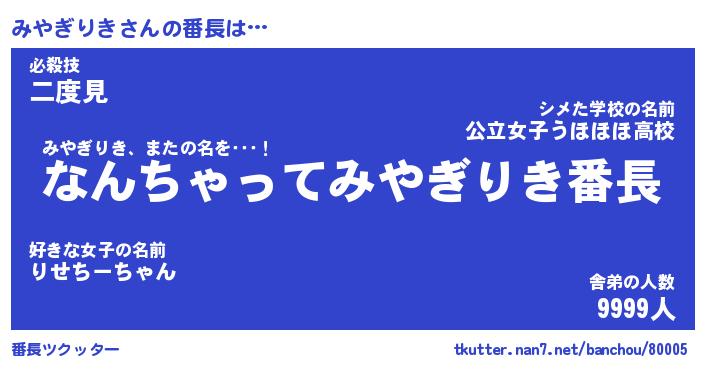 | ファンタジー風あだ名 | 『ミヤフェル』『エターナルミヤギリキー』 |