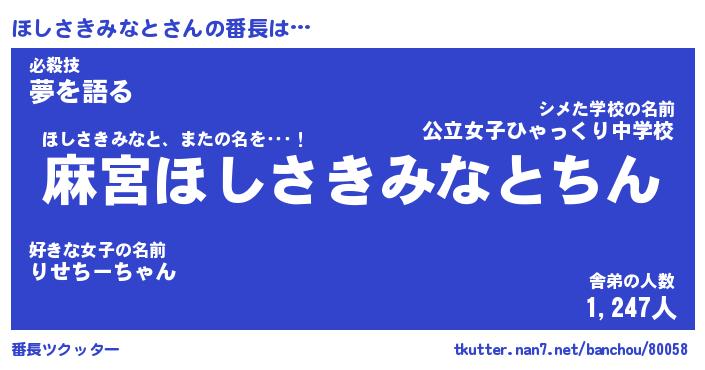 | 伝説のあだ名 | 『不死鳥のスナイパーほしさきみなと』 |