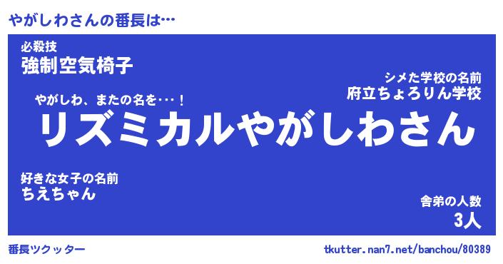 | 意味不明あだ名 | 『ペロリンやがしわ』『永久保存やがしわ』 |