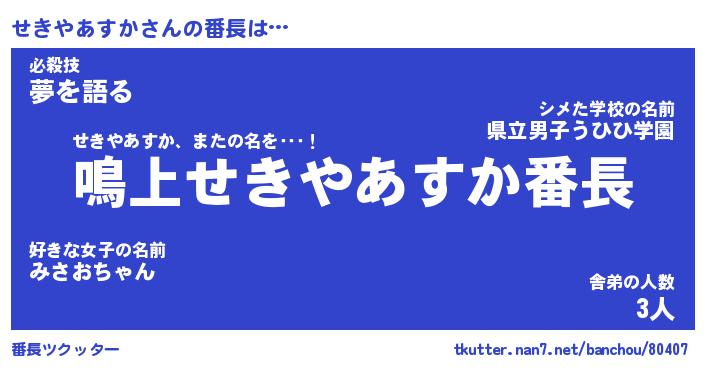 | ヒーロー風カッコイイあだ名 | 『スーパーセキヤアスカ』『魔戒騎士セキ』 |