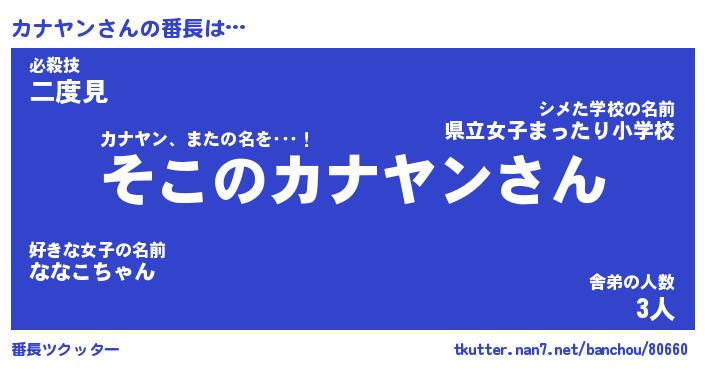 | 男性向けラノベタイトル風あだ名 | 『カナヤンの憂鬱』 |