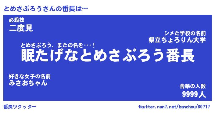 | ヒーロー風カッコイイあだ名 | 『スーパートメサブロウ』『炎刃騎士トメ』 |