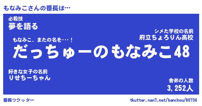 | 肩書あだ名 | 『もなみこ店長』『もなみこ国家主席』 |