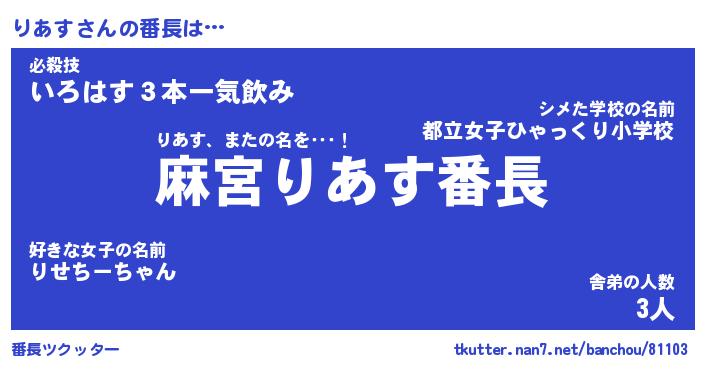 | 肩書あだ名 | 『りあす社長』『りあす国家主席』 |