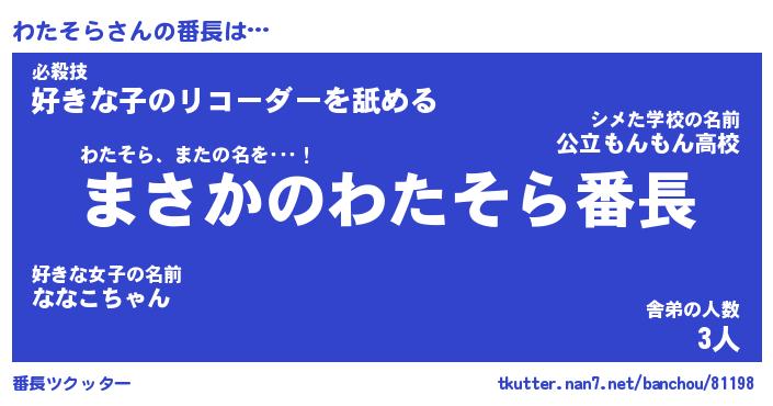 | 伝説のあだ名 | 『伝説のスナイパーわたそら』 |