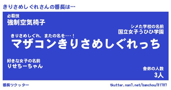 | 伝説のあだ名 | 『封印されしスナイパーきりさめしぐれ』 |