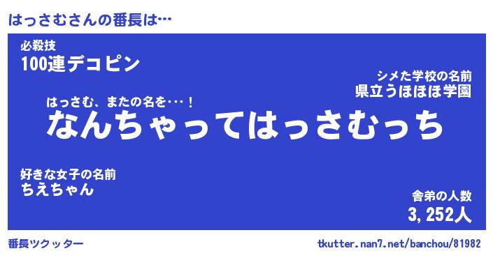 | 意味不明あだ名 | 『ペロリンはっさむ』『永久保存はっさむ』 |
