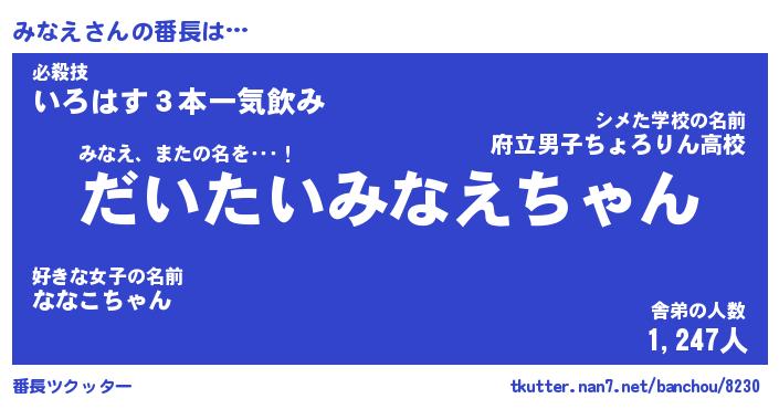 | 肩書あだ名 | 『みなえ店長』『みなえ国家主席』 |