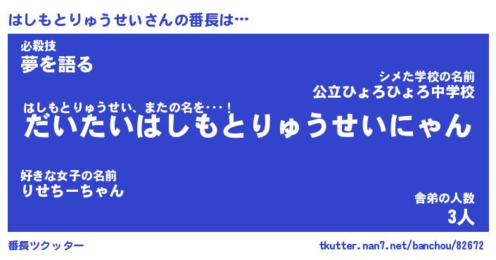 | 男性向けラノベタイトル風あだ名 | 『はしもとりゅうせいの憂鬱』 |