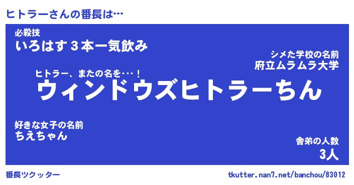 | 意味不明あだ名 | 『ペロリンヒトラー』『永久保存ヒトラー』 |