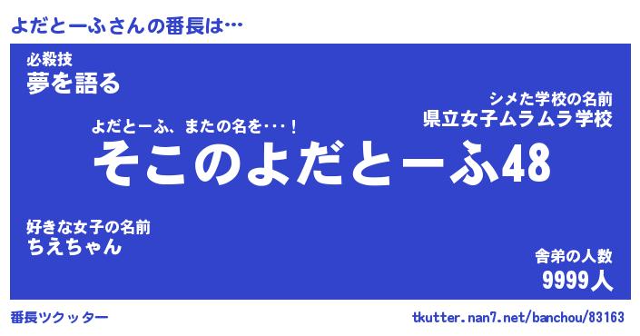| 肩書あだ名 | 『よだとーふ社長』『よだとーふ大統領』 |