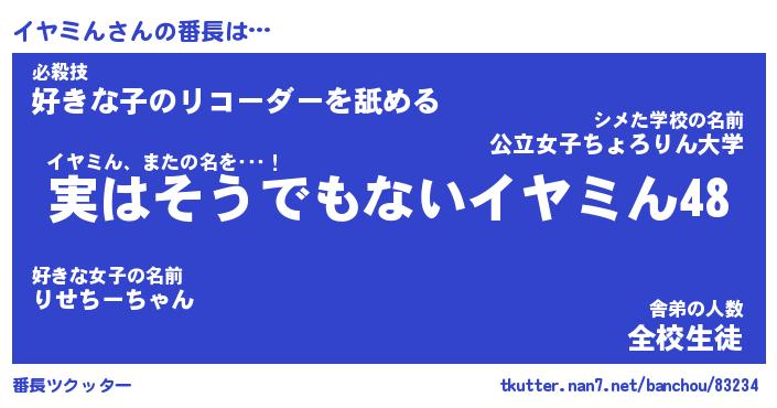 | 意味不明あだ名 | 『ペロリンイヤミん』『永久保存イヤミん』 |