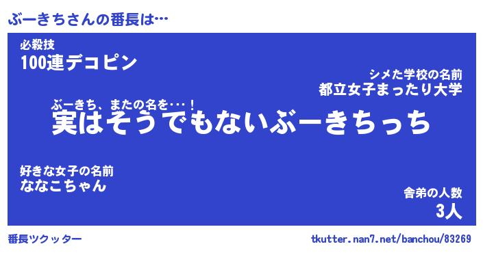 | 意味不明あだ名 | 『ペロリンぶーきち』『永久保存ぶーきち』 |