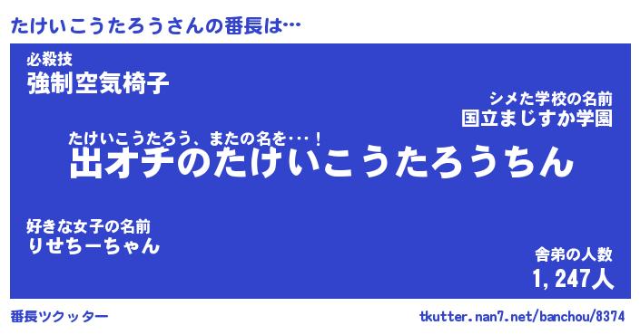 | 男性向けラノベタイトル風あだ名 | 『たけいこうたろうの憂鬱』 |
