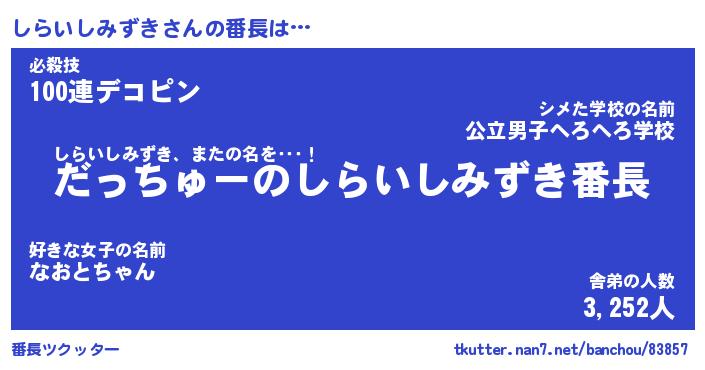 | 伝説のあだ名 | 『伝説のスナイパーしらいしみずき』 |