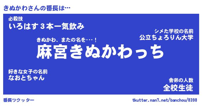 | 意味不明あだ名 | 『ペロリンきぬかわ』『永久保存きぬかわ』 |
