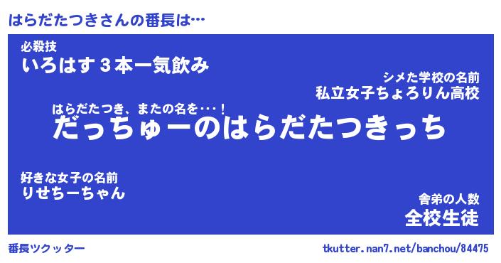 | 肩書あだ名 | 『はらだたつき社長』『はらだたつき班長』 |