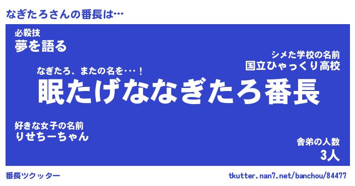 | 意味不明あだ名 | 『ペロリンなぎたろ』『永久保存なぎたろ』 |