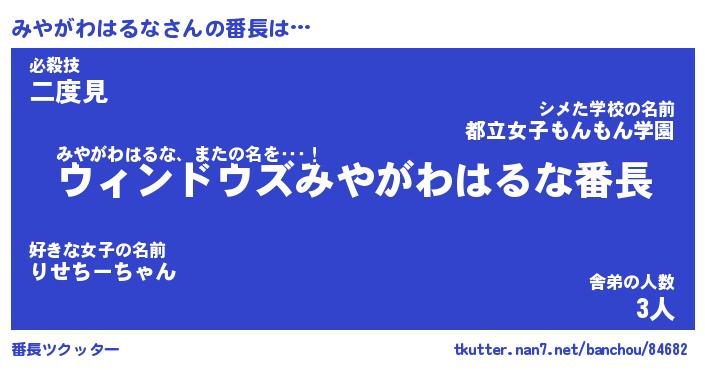 | 女子向けラノベタイトル風あだ名 | 『(仮)みやがわはるなのやんごとなき事情』 |