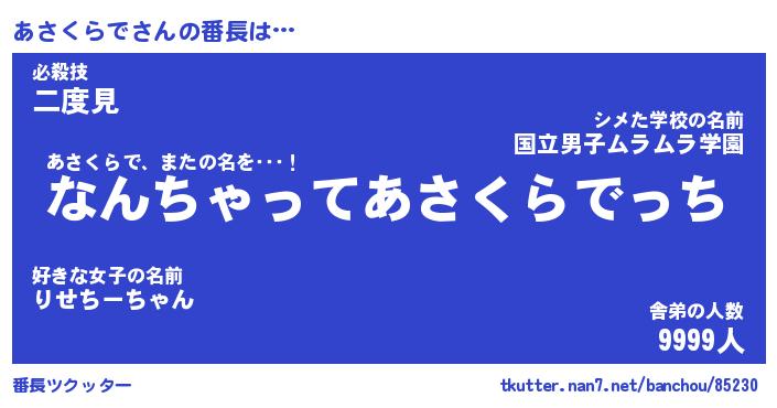 | 肩書あだ名 | 『あさくらで店長』『あさくらで総理大臣』 |