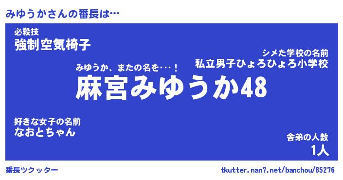 | 意味不明あだ名 | 『ペロリンみゆうか』『永久保存みゆうか』 |