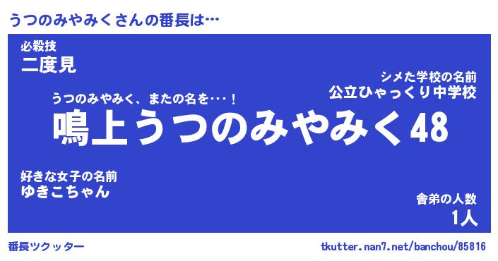 | 伝説のあだ名 | 『封印されしスナイパーうつのみやみく』 |