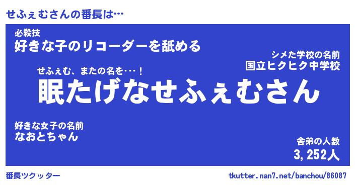 | 伝説のあだ名 | 『封印されしスナイパーせふぇむ』 |