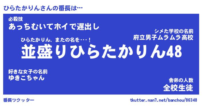 | ヒーロー風カッコイイあだ名 | 『スーパーヒラタカリン』『天弓騎士ヒラ』 |