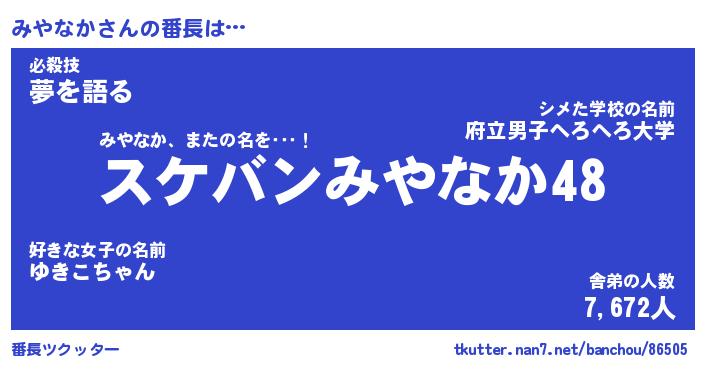 | ヘコむあだ名 | 『みやにゅー』『豆乳』『みやっぺ』 |