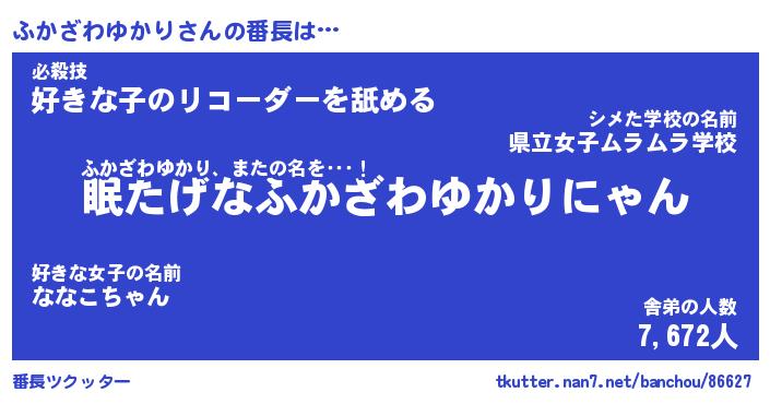 | 伝説のあだ名 | 『封印されしスナイパーふかざわゆかり』 |