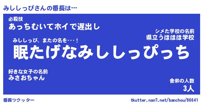 | 伝説のあだ名 | 『封印されしスナイパーみししっぴ』 |