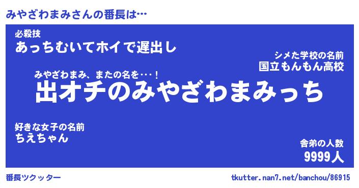 | ヒーロー風カッコイイあだ名 | 『スーパーミヤザワマミ』『天弓騎士ミヤ』 |