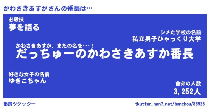 | ヘコむあだ名 | 『かわにー』『豆乳』『かわぷりん』 |