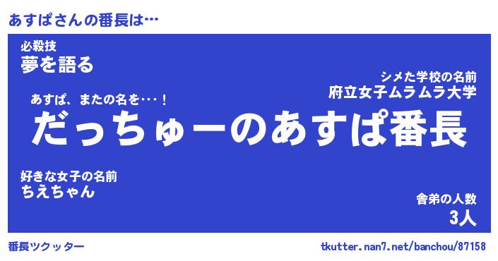 | 意味不明あだ名 | 『ペロリンあすぱ』『あすぱフォーエバー』 |