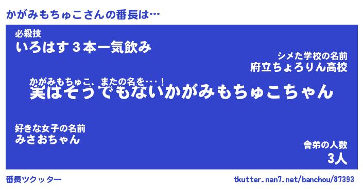 | 伝説のあだ名 | 『封印されしスナイパーかがみもちゅこ』 |