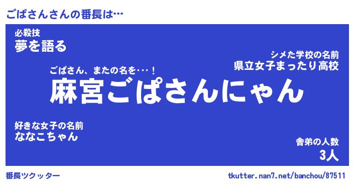 | 肩書あだ名 | 『ごぱさん社長令嬢』『ごぱさん総理大臣』 |