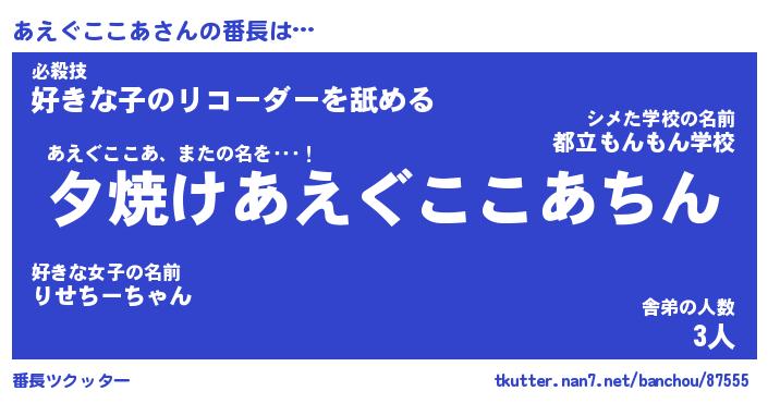 | 伝説のあだ名 | 『封印されしスナイパーあえぐここあ』 |