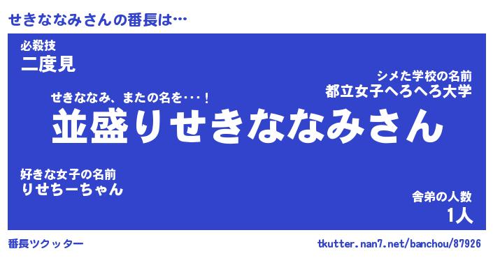 | ファンタジー風あだ名 | 『セキフェル』『エターナルセキナナミー』 |
