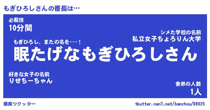 | ヘコむあだ名 | 『もぎにゅー』『豆乳』『もぎお』 |