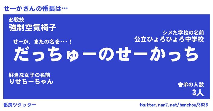 | ピコ太郎風あだ名 | 『セコ二郎』『ピセ次郎』『セー八郎』 |