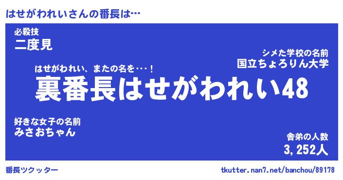 | ヘコむあだ名 | 『はせもー』『つくし』『はせっ子』 |