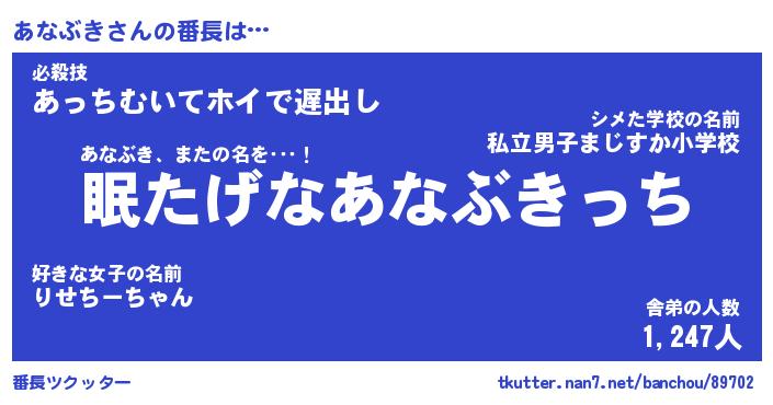 | 意味不明あだ名 | 『ペロリンあなぶき』『永久保存あなぶき』 |